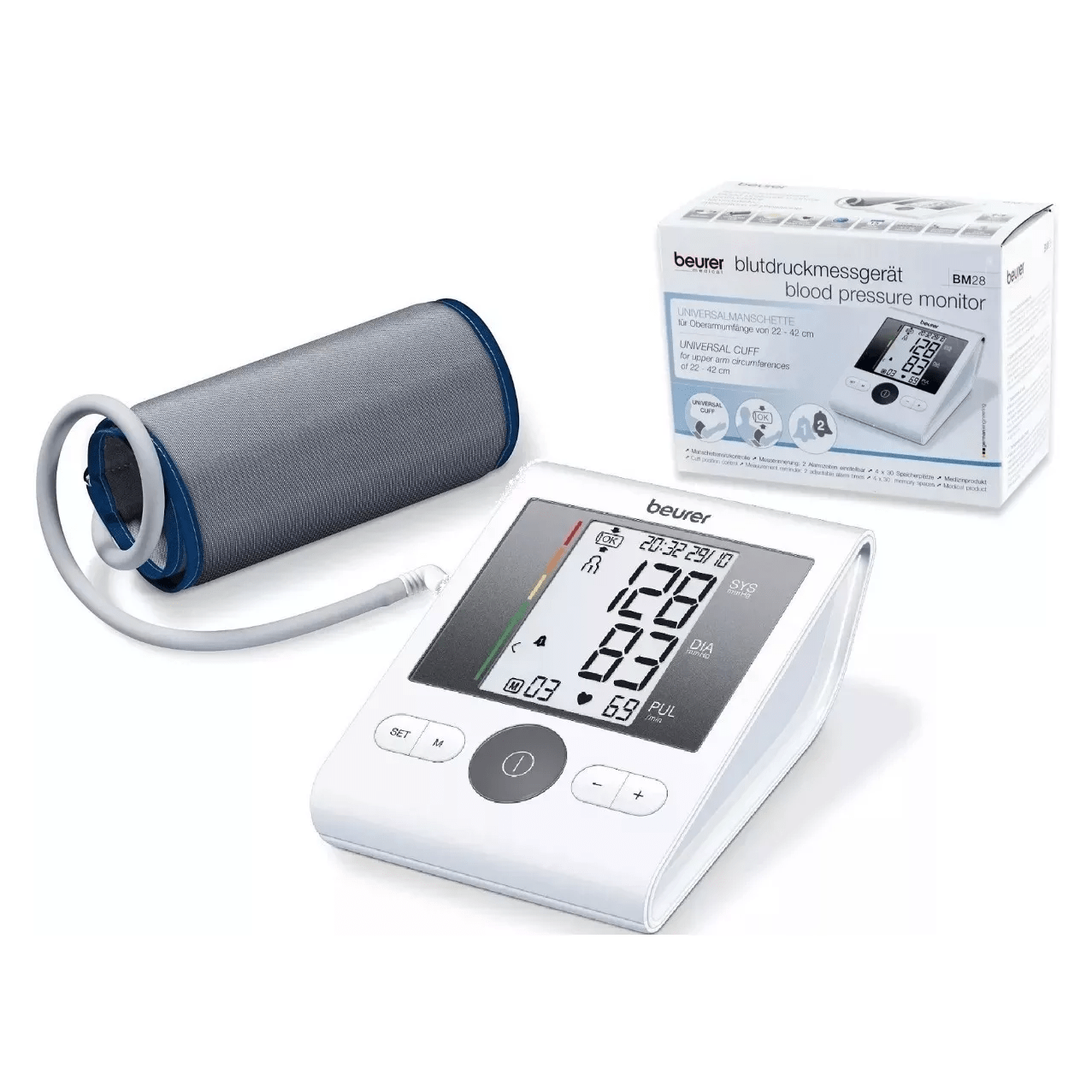 One for all, the blood pressure monitor has a universal cuff which is also suitable for circumferences of up to 42 cm in the upper arm. The integrated cuff location control provides additional clarity during each assessment about the precision of the recorded blood pressure values.