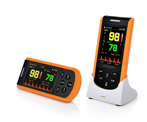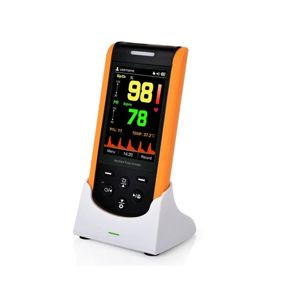 Creative SP-20 Handheld Oximeter can measure SpO2, PI, waveform, and PR for adults, pediatrics, and neonates. With a 3.5” auto rotation TFT display and large data storage, it is user-friendly both in the clinical scenario and for hospital, clinic, office, and home use. The SP-20 display automatically rotates for vertical or horizontal viewing. On the backside of the oximeter, there is a stand that can be used to hold the oximeter while on its side.