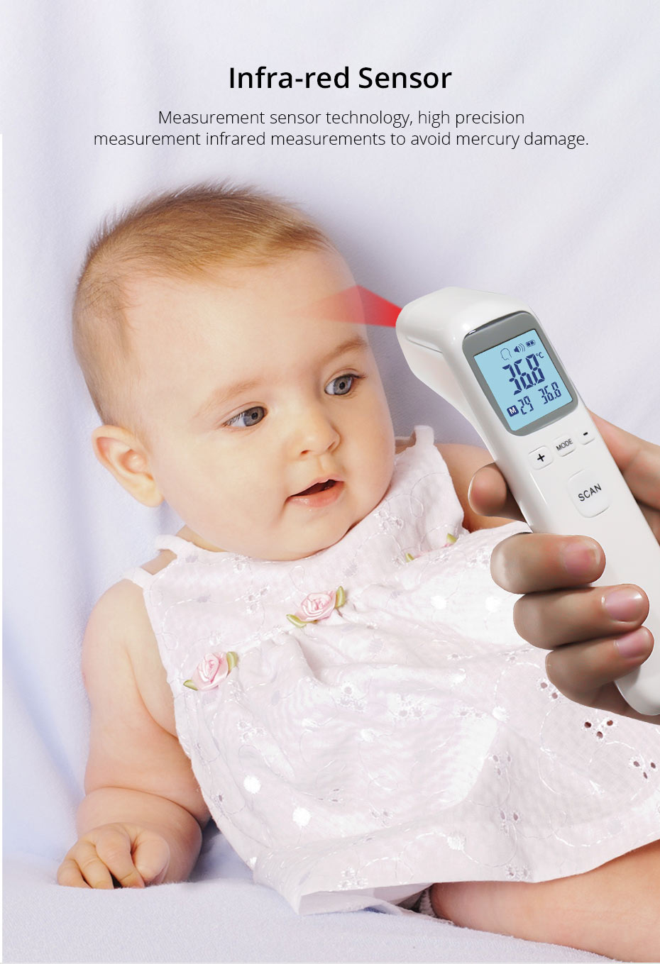 One-button measurement, one second test temperature Multiple modes to test infants or ambient temperatures Small and portable, complimentary storage bag Supports up to 32 sets of memory HD display large screen, temperature font enlargement prompt Battery voltage: DC3V (2 AAA alkaline batteries) Measuring range: 34.0 ℃ ~ 43.0 ℃ Measurement accuracy: <35.0 ℃ and> 42.0 ℃: ± 0.3 ℃ 35.0 ° C to 42.0 ° C: ± 0.2 ° C Measuring distance: 5 ~ 15 cm Measurement interval: about 6 seconds Storage: -20 ℃ ~ 45 ℃, relative humidity: ≦ 85%