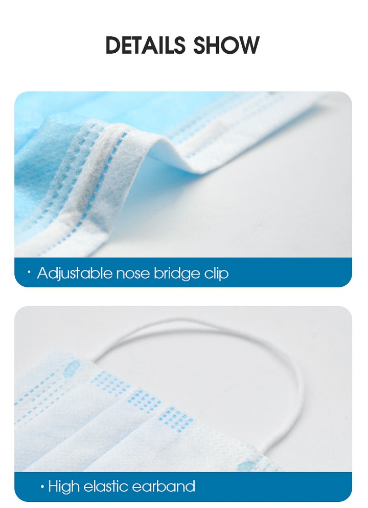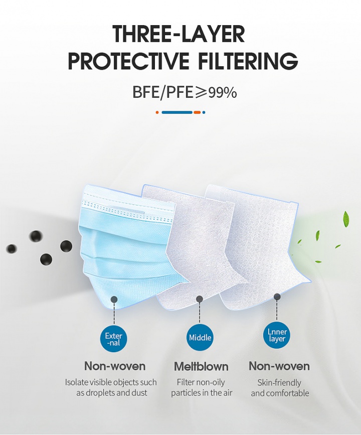 Medical High-performance filter cloth BEF up to 95% Uniquely designed, comfortable elastic soft ear loop, eliminate pressure to the ears. The inner layer is made of soft facial tissue, no dye, and is comfortable to the skin. Keep your mouth covered and protect yourself from pollution, fluids, and dust. Comfortable & fitting, Mask is made of non-woven fabric for easy breathability. Keep out the virus